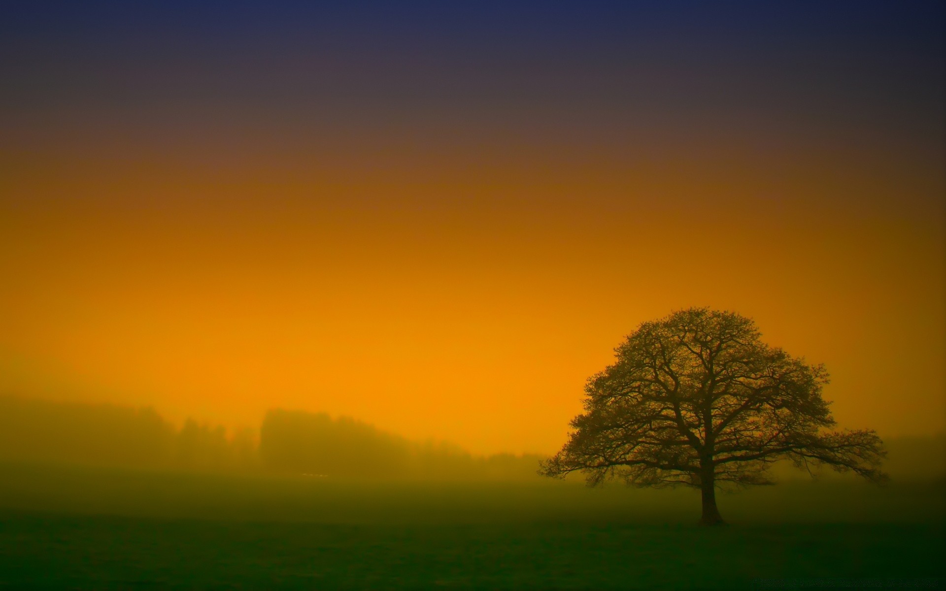 Paesaggio al tramonto di un albero nella nebbia