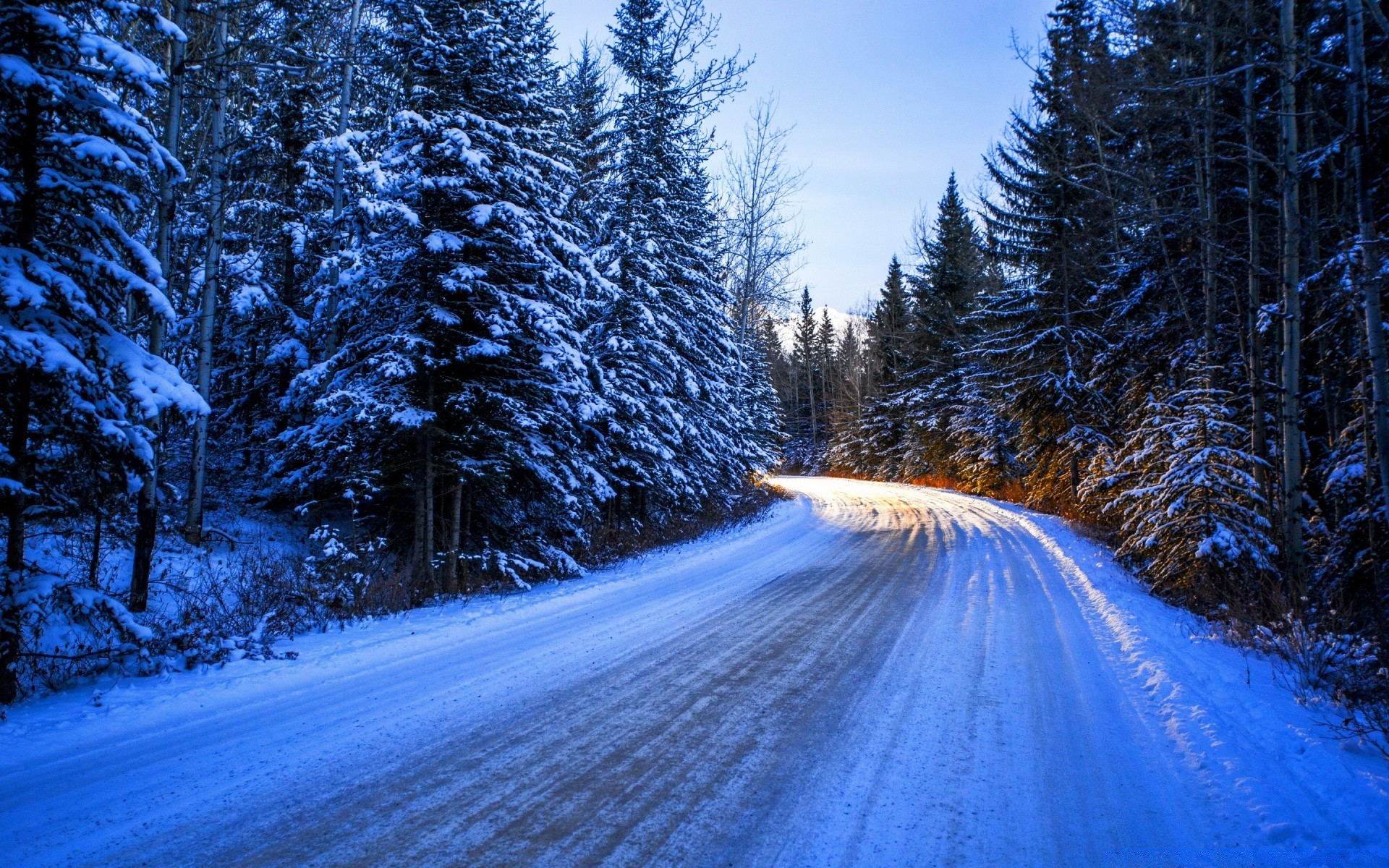 Strada nella foresta fredda invernale tra gli alberi di Natale