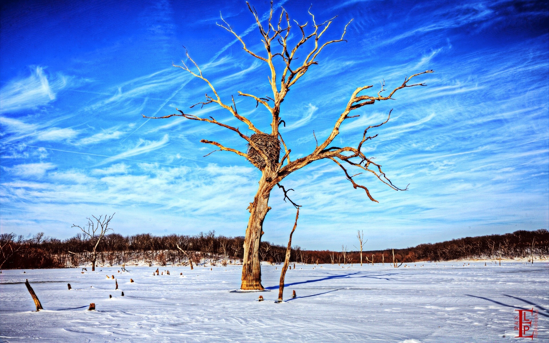 Albero solitario con nido sullo sfondo della natura invernaleAlbero solitario con nido sullo sfondo della natura invernale