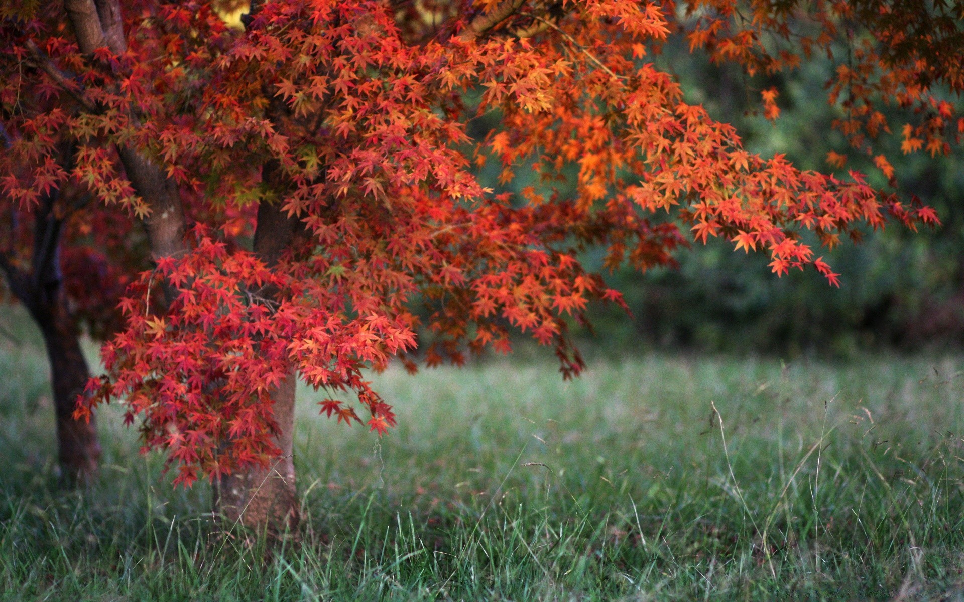 Contrasto luminoso di rosso e verde. Paesaggio autunnale