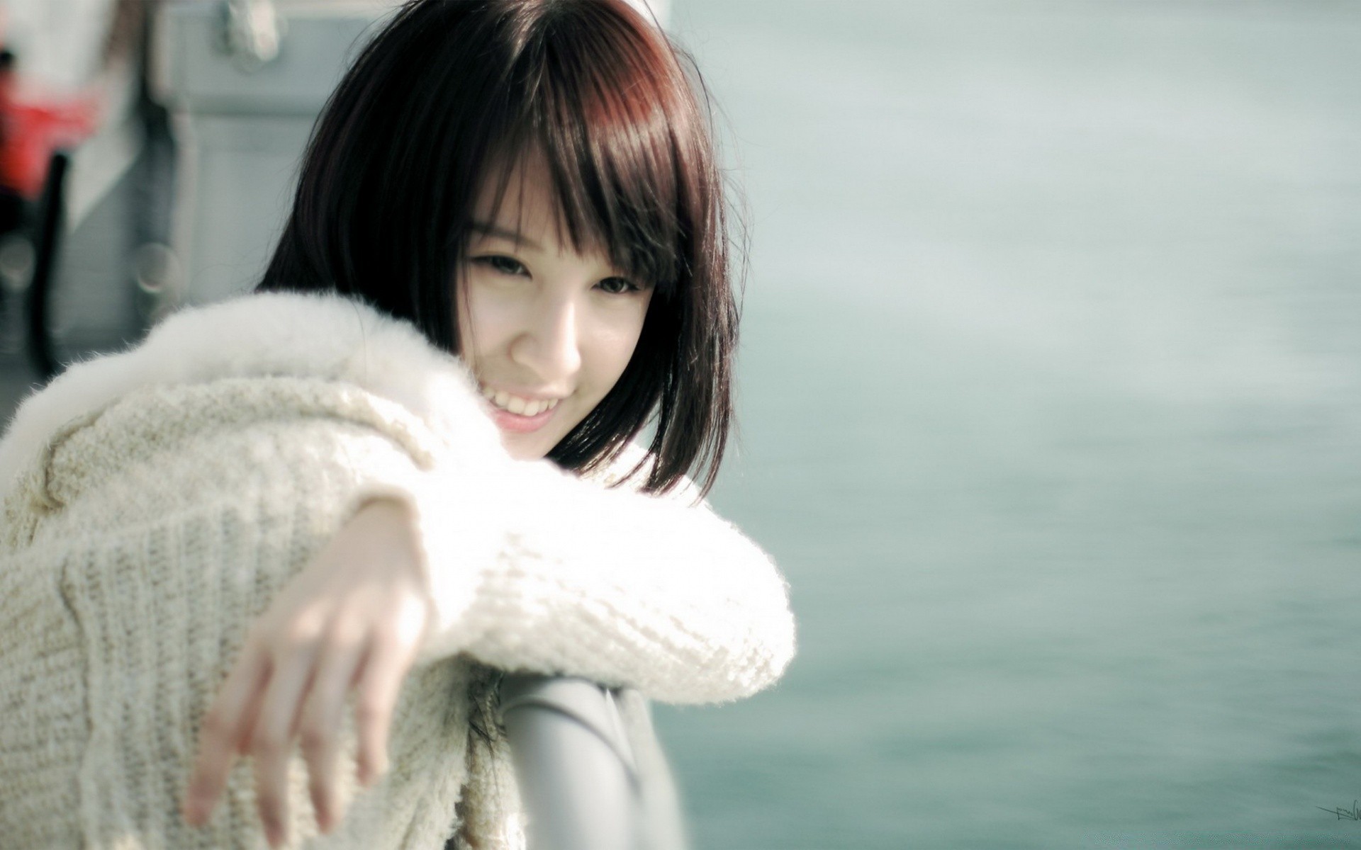 Ritratto di una ragazza in un maglione sul mare