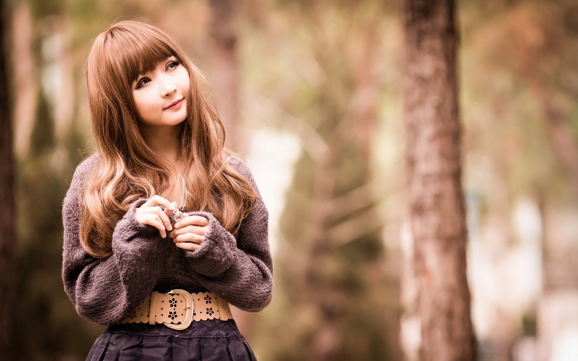 Ragazza orientale con i capelli lunghi su sfondo sfocato di alberi