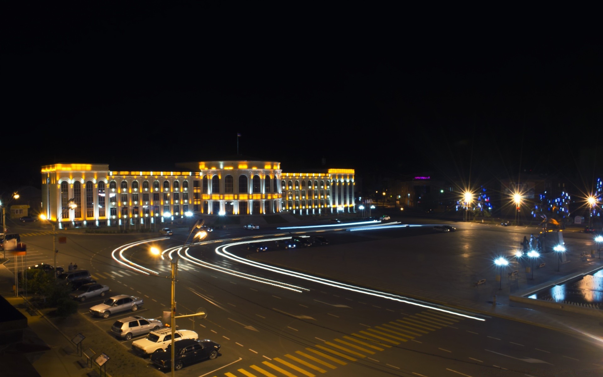 Paesaggio notturno dinamico con grattacieli e strade principali