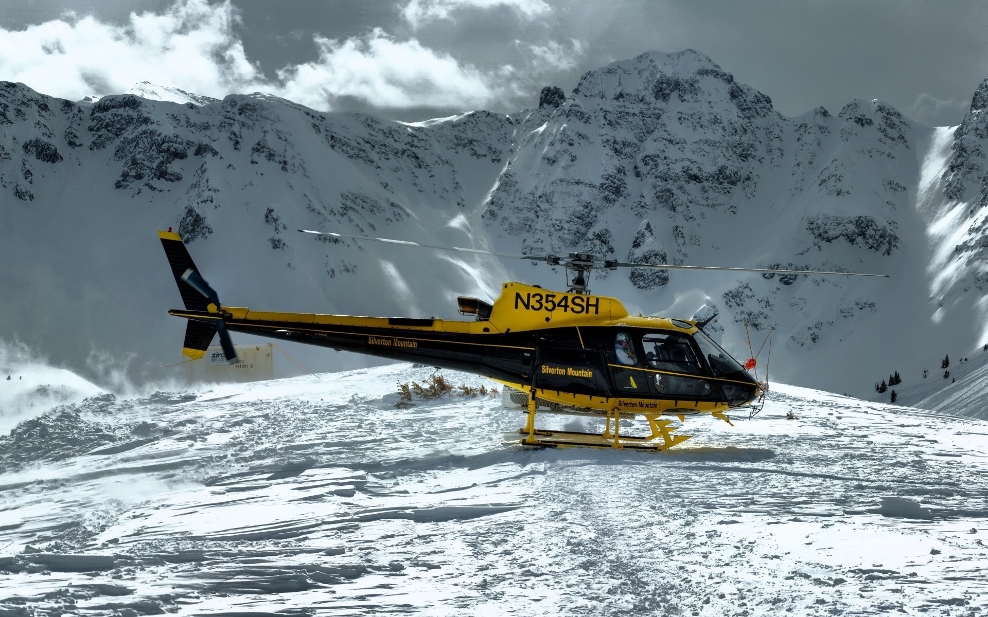 Elicottero giallo-nero sulla neve sullo sfondo delle montagne