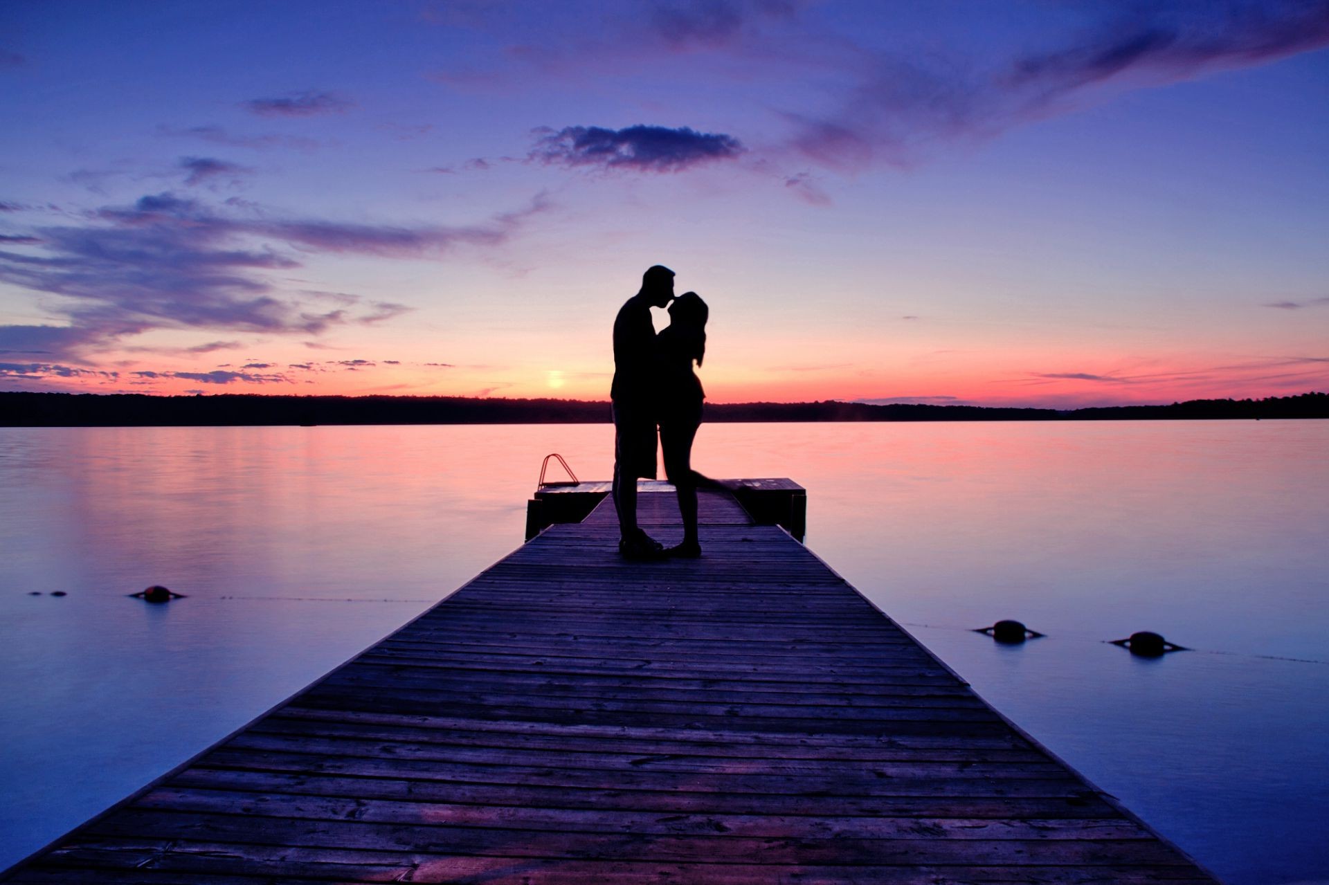 Coppia innamorata incontra l'alba sulla spiaggia sotto le palme in riva al mare