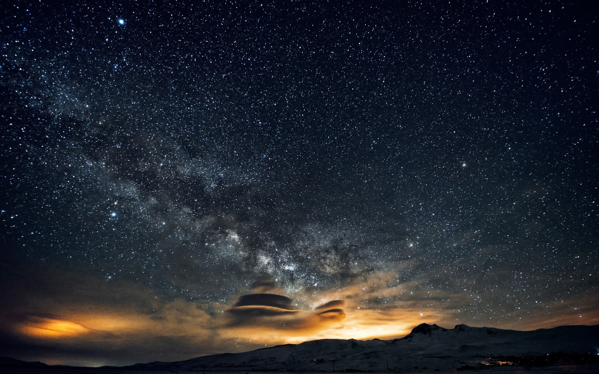 Tre cavalli bianchi sul mare e uno sfondo stellato del cielo nero