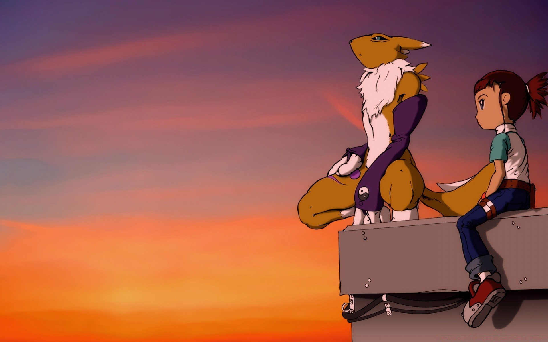 Ragazza seduta sul tetto con un animale di fantasia sullo sfondo del tramonto