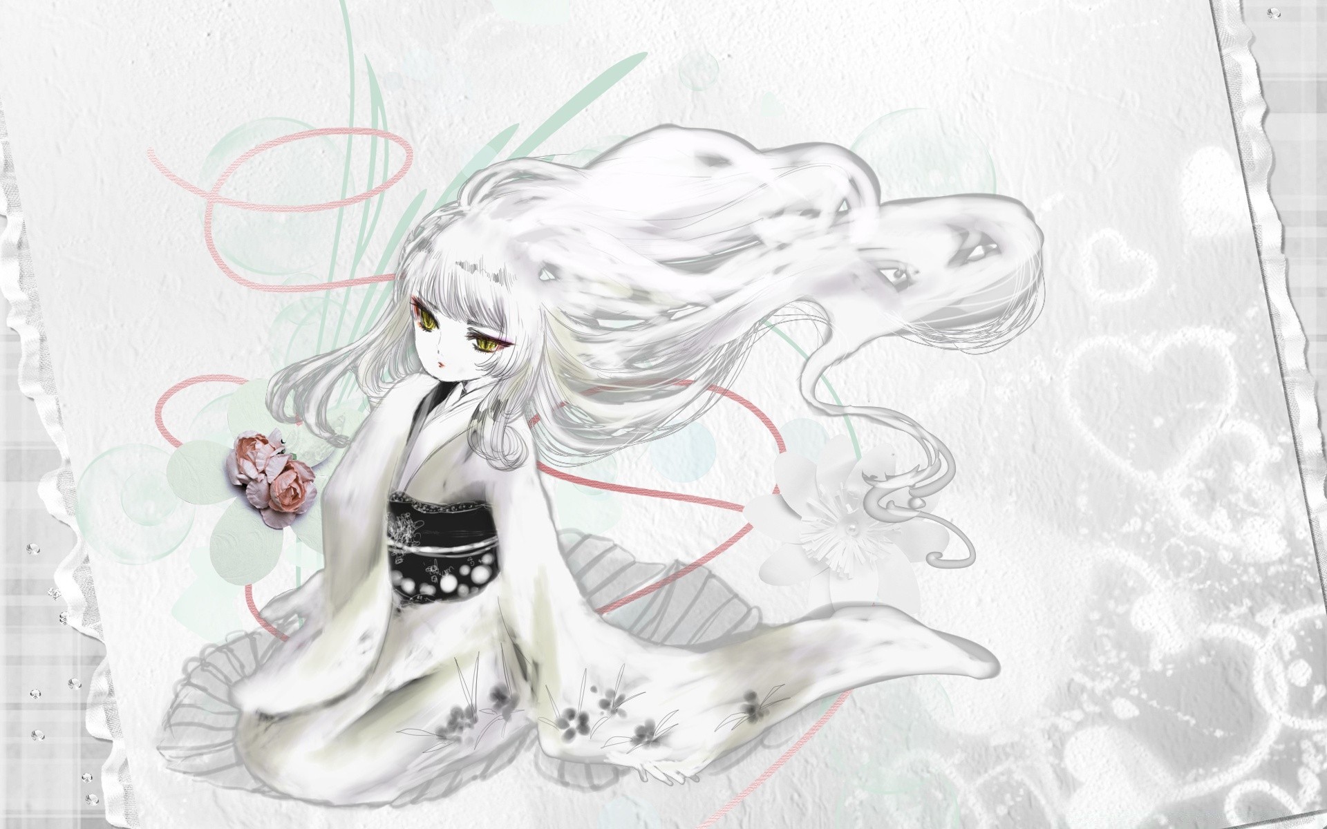 Ragazza in kimono bianco con lunghi capelli bianchi anime