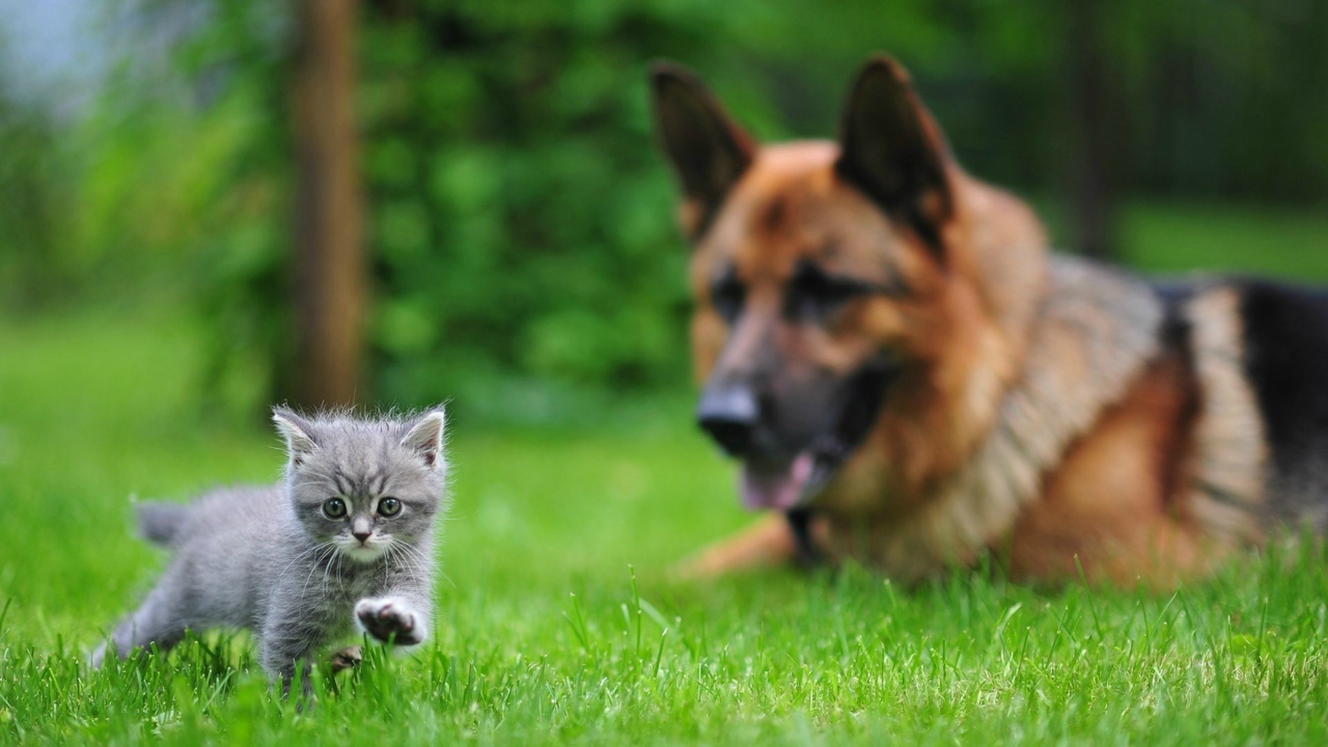Pastore tedesco e piccolo gattino grigio