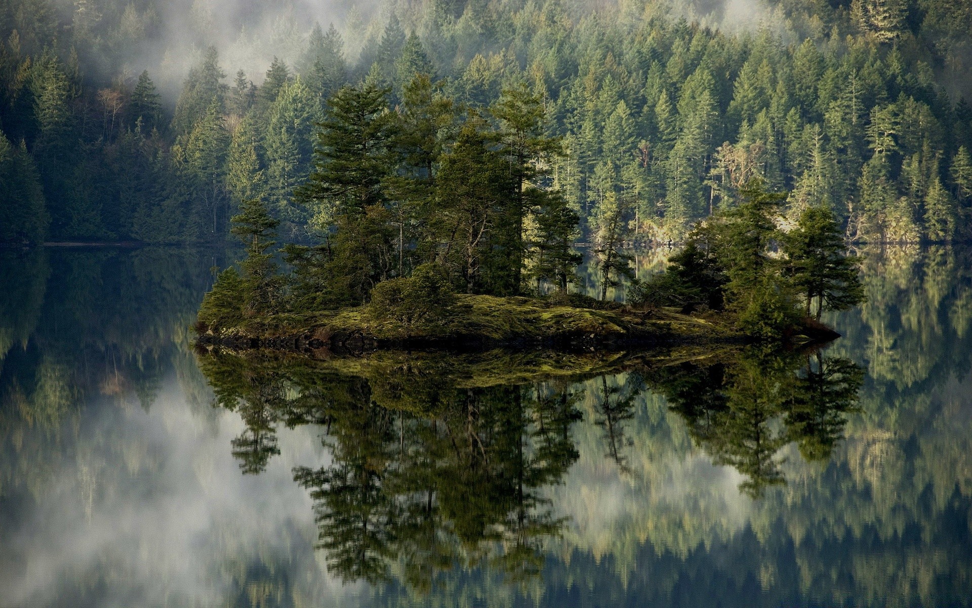 Notte. Il fuoco sta bruciando. Il riflesso della foresta nel lago è perfetto