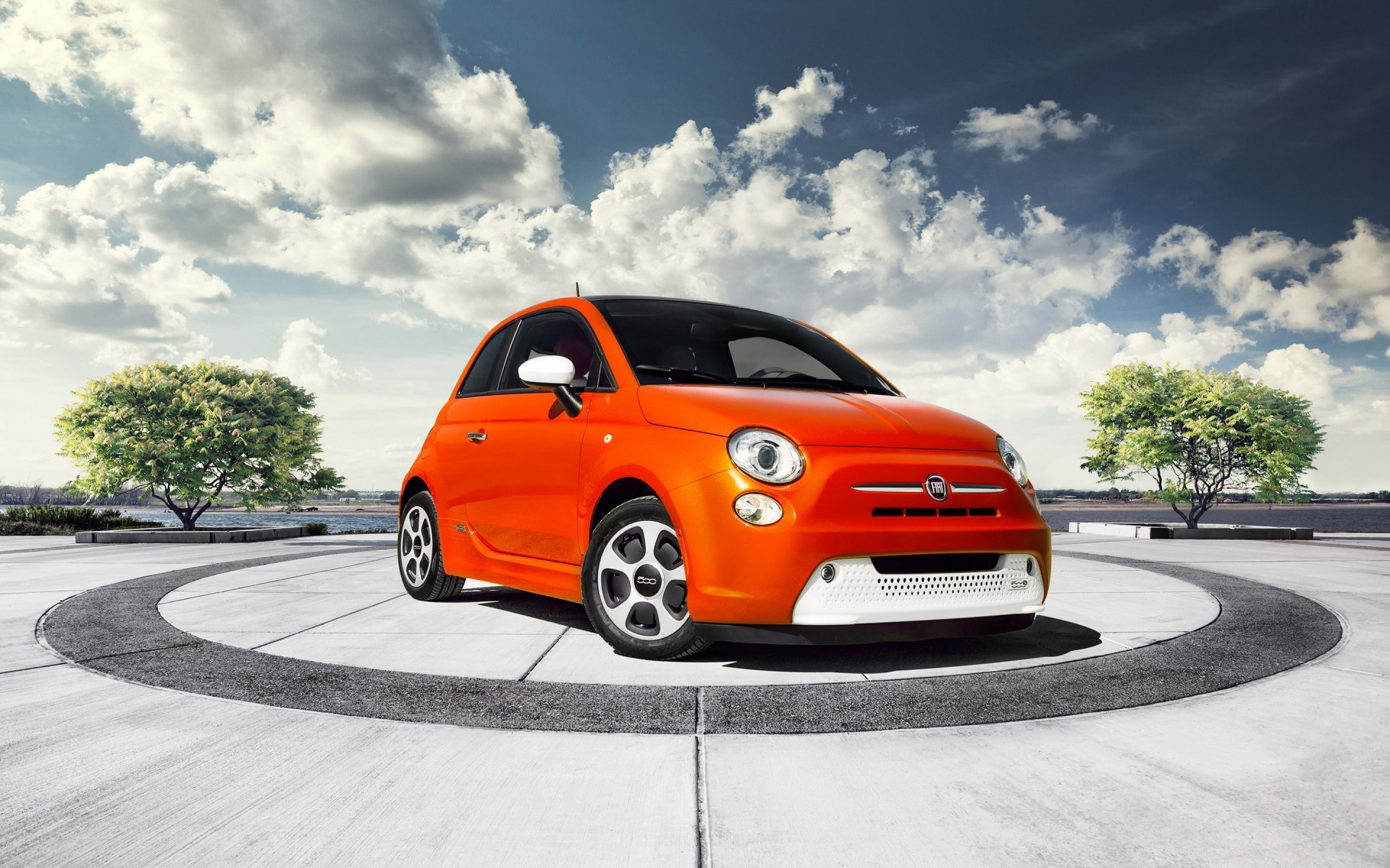 Piccola fiat arancione al centro del cerchio contro il cielo nuvoloso