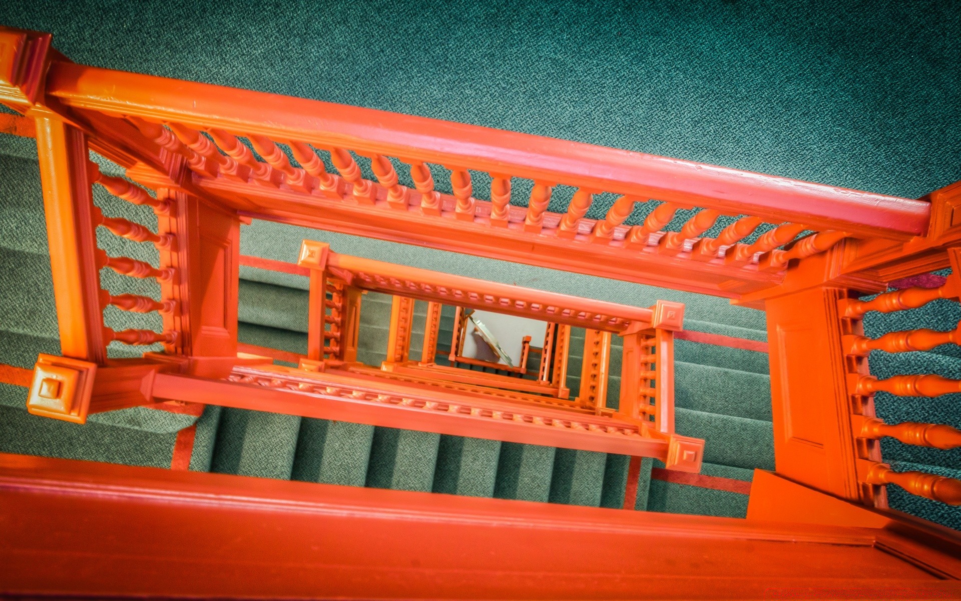 Ampia scala all'interno dell'edificio con una bella architettura nei caldi toni del giallo