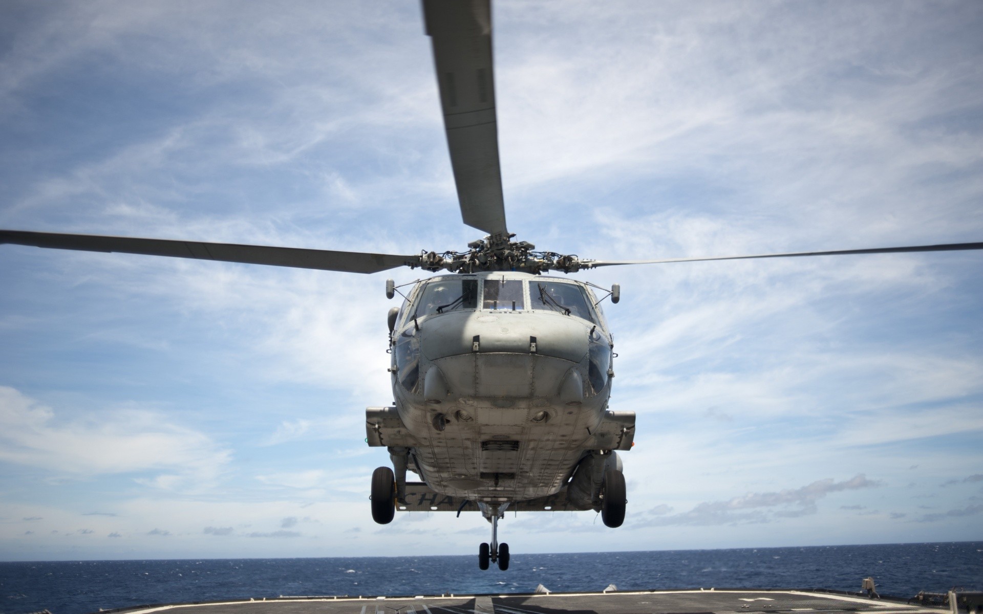 Elicottero sopra la piattaforma di decollo sulla naveElicottero sopra la piattaforma di decollo sulla nave