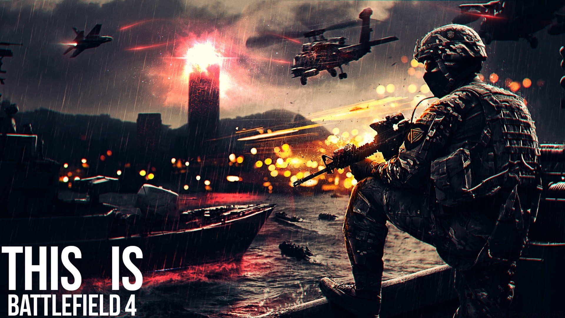 Uomo con armi e barca militare