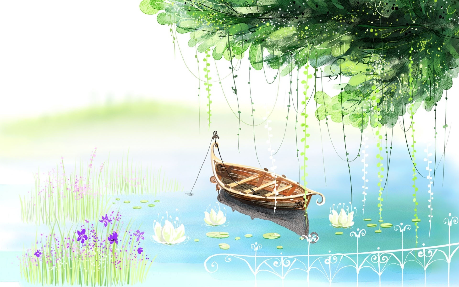 Barca vuota, sgonfiata su uno stagno con gigli