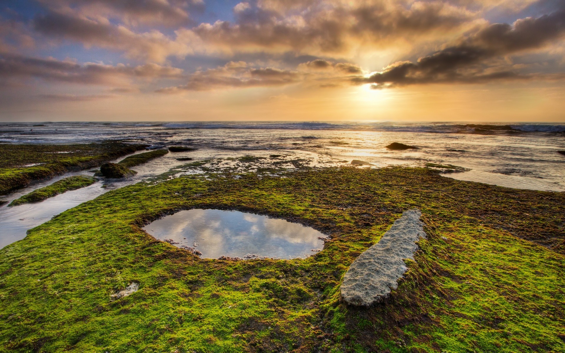 Alba sulla riva muschiosa del mare