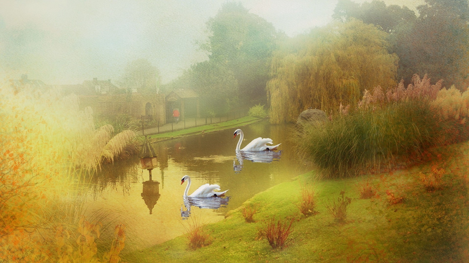 Coppia di cigni in acqua su uno sfondo di boschettiCoppia di cigni in acqua su uno sfondo di boschetti