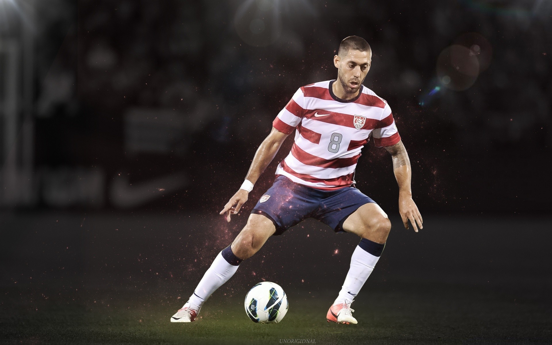 Il calciatore ha segnato un gol in uniforme rossa blu esulta in ginocchio