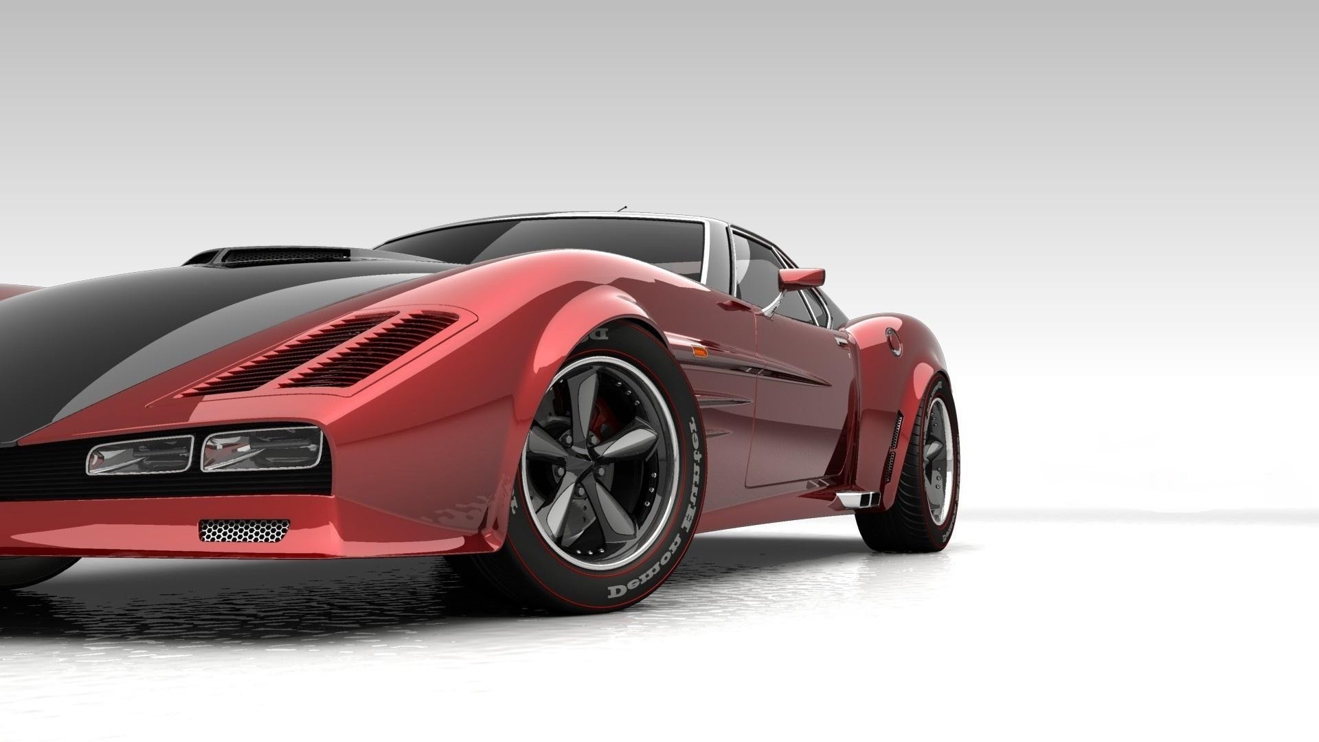 Auto sportiva rossa sulla strada asfaltata accanto al prato verde
