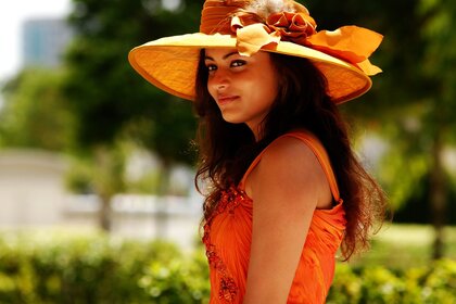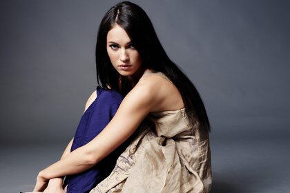 Dai capelli lunghi bruna impressionante guardando la fotocamera