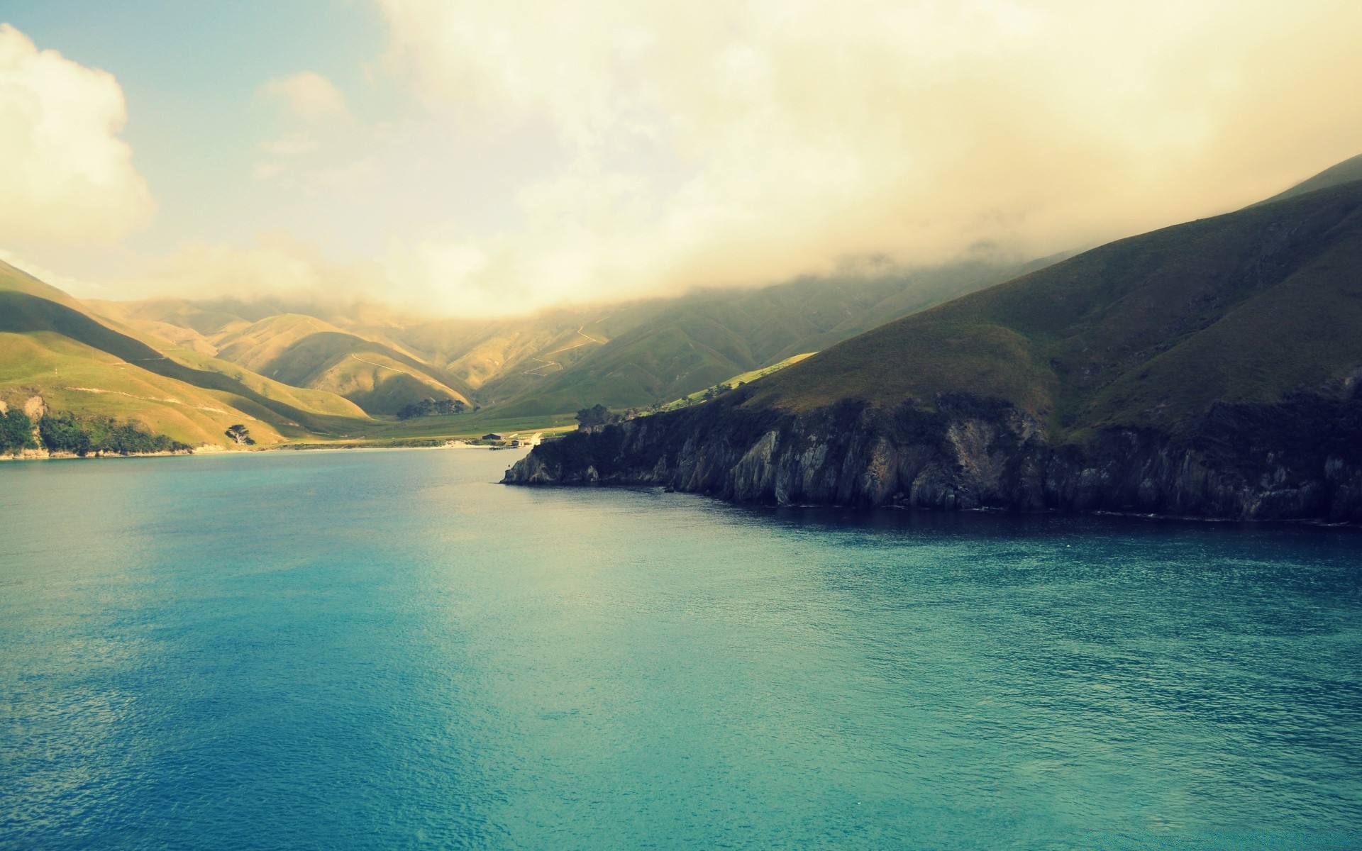 Bella costa rocciosa e foschia di nebbia in lontananza
