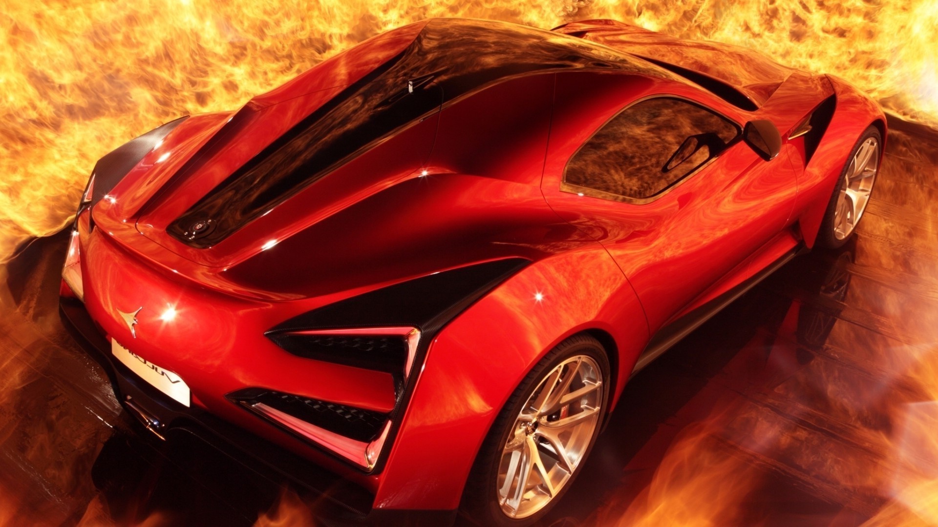Un'auto sportiva argentata si trova sulla strada tra le verdi colline