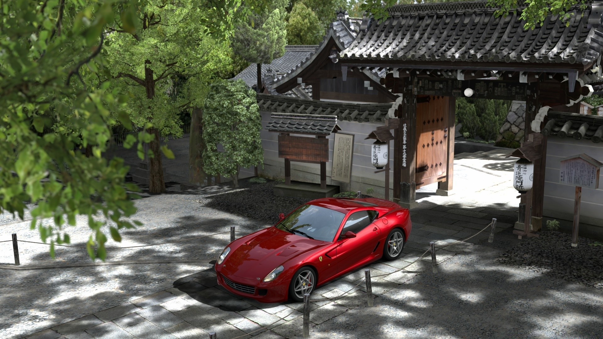L'auto da corsa rossa si trova vicino al cancello aperto