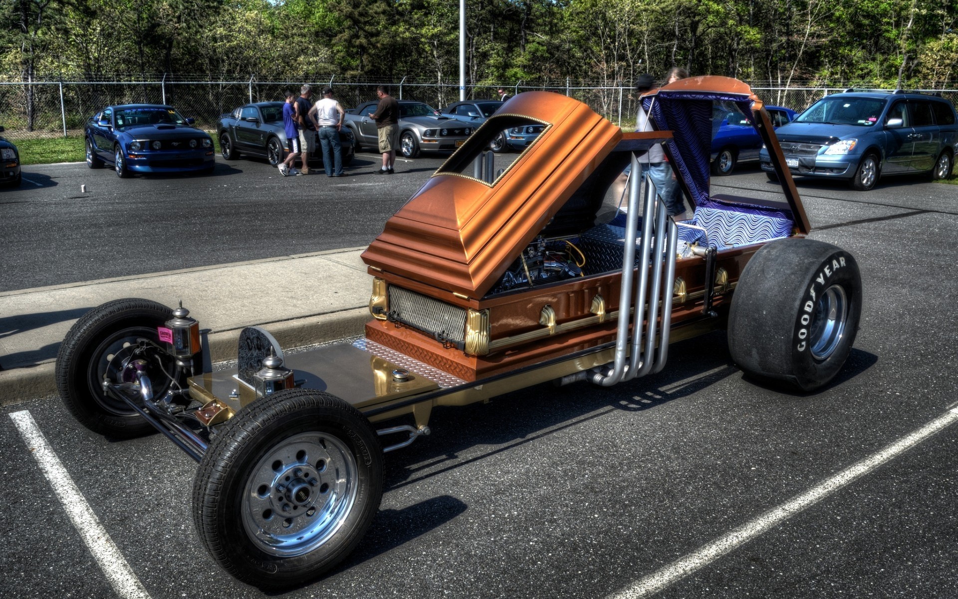 Auto Ferrari che corre lungo l'autostrada lungo una fila di cipressi