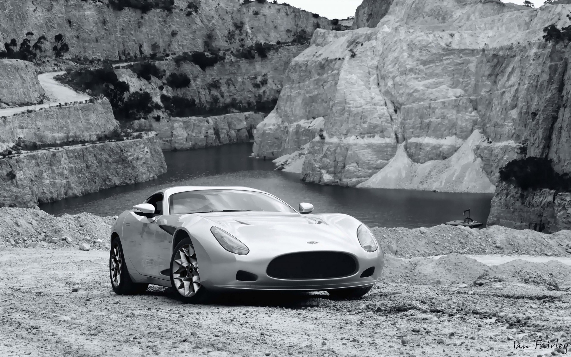 Auto grigia nelle Montagne Grigie vicino al lago grigio