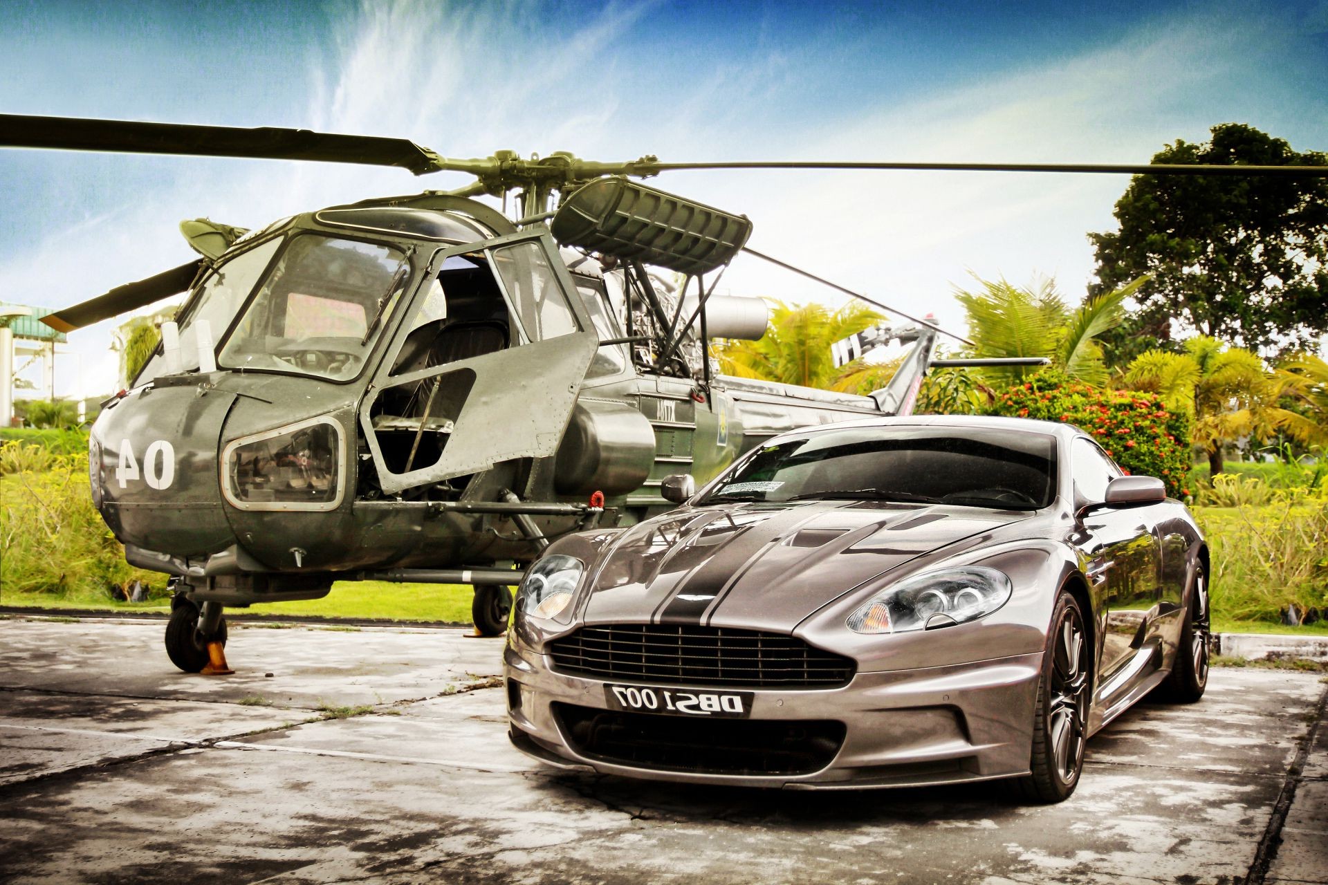 Elicottero e auto nel parcheggio, dietro di loro alberi ed erba