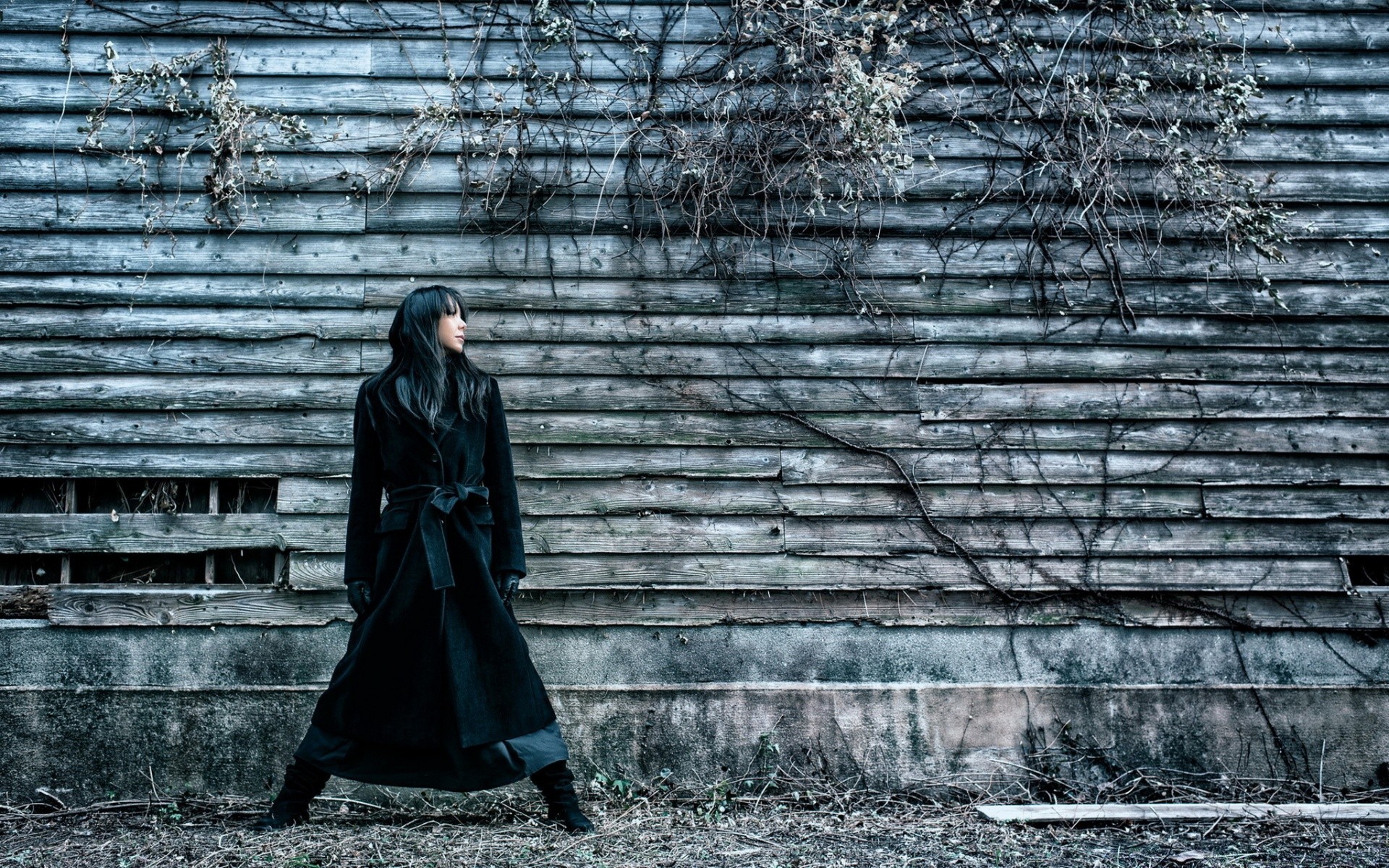 Ragazza in un impermeabile sullo sfondo di un vecchio fienile