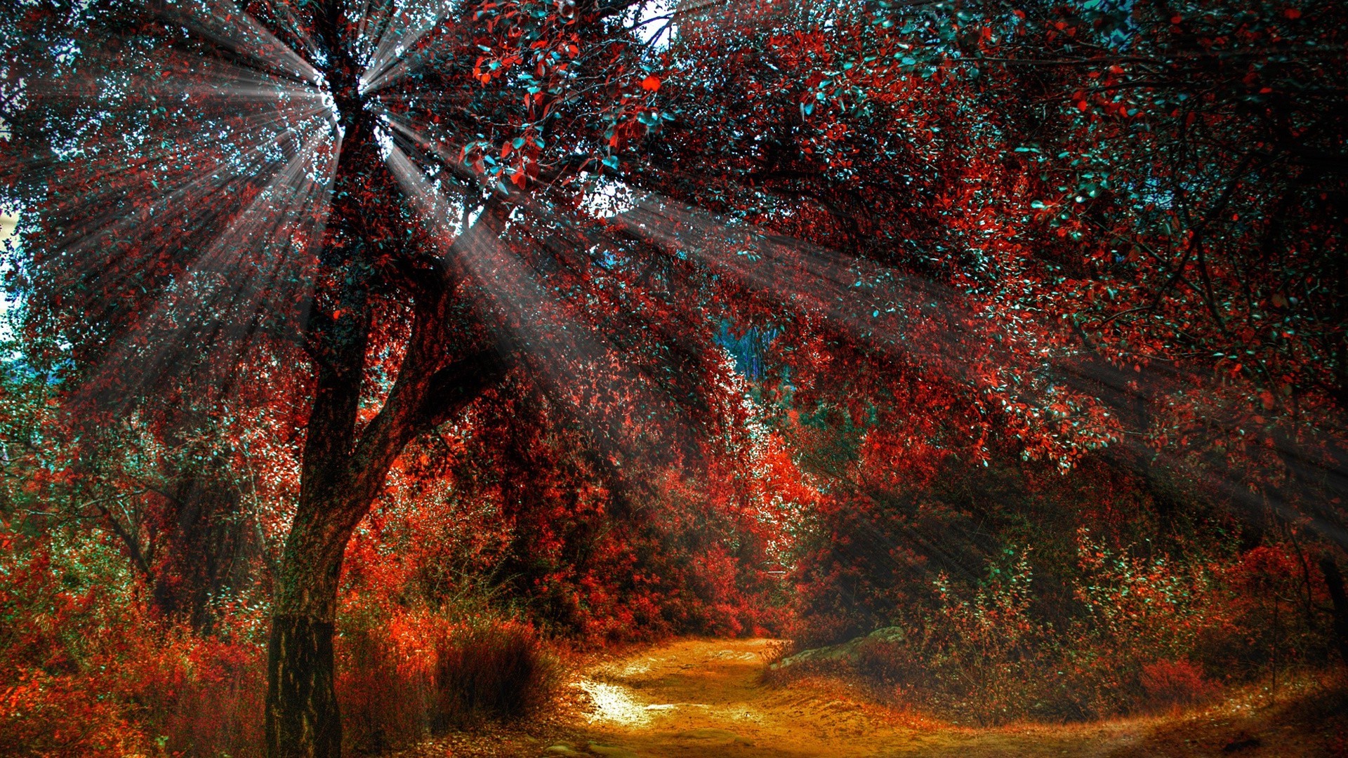 Natura autunnale, alberi dipinti con colori vivaci, sul loro sfondo un lago