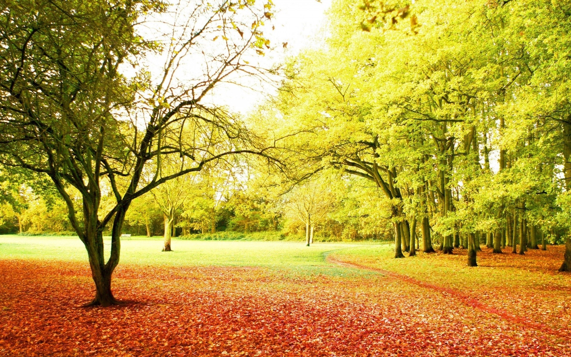 Paesaggio con panchina e tavolo nella foresta d'autunno