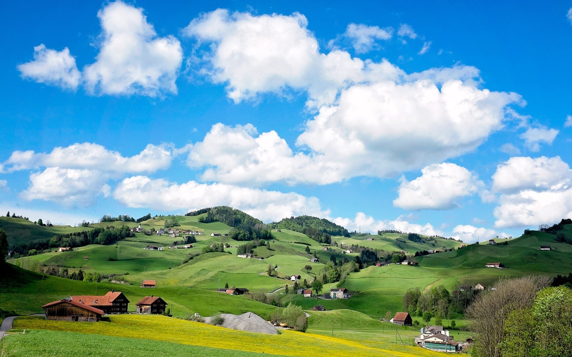 Montagne Grigie su uno sfondo di cielo giallo ed erba verde