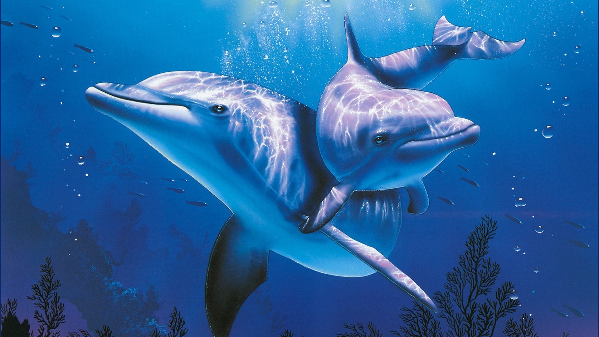 Baciare una ragazza con i capelli lunghi e un delfino
