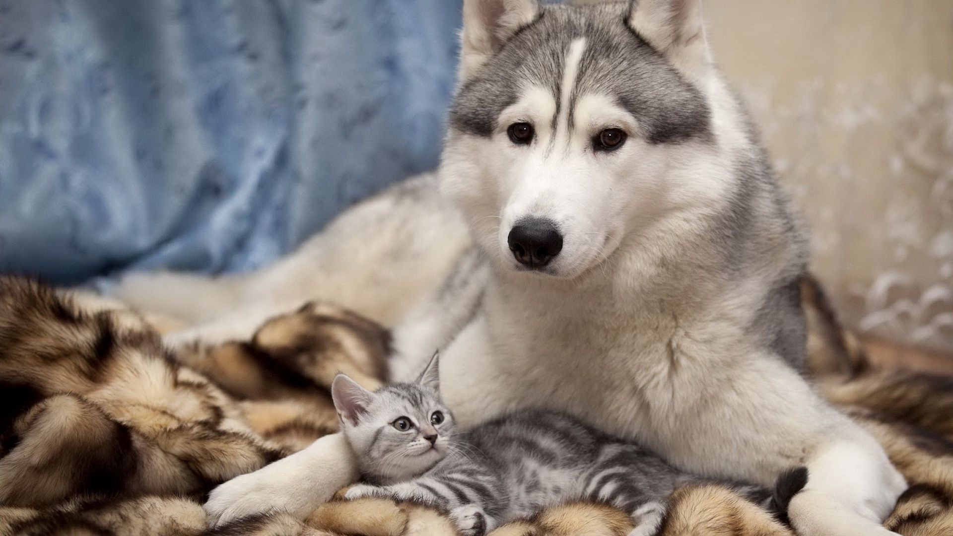 Immagine di un cane di razza Husky con un gatto su un plaid