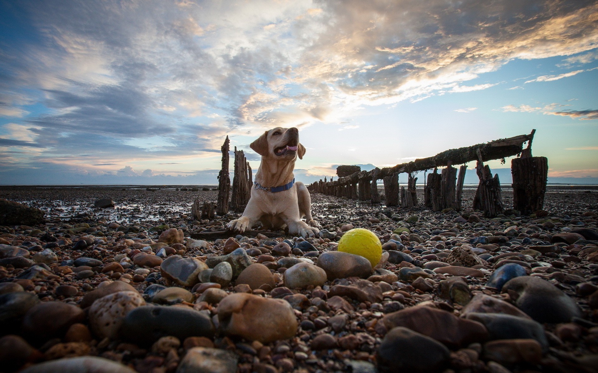 Cane che gioca con una palla da tennis sulle rocce del mare