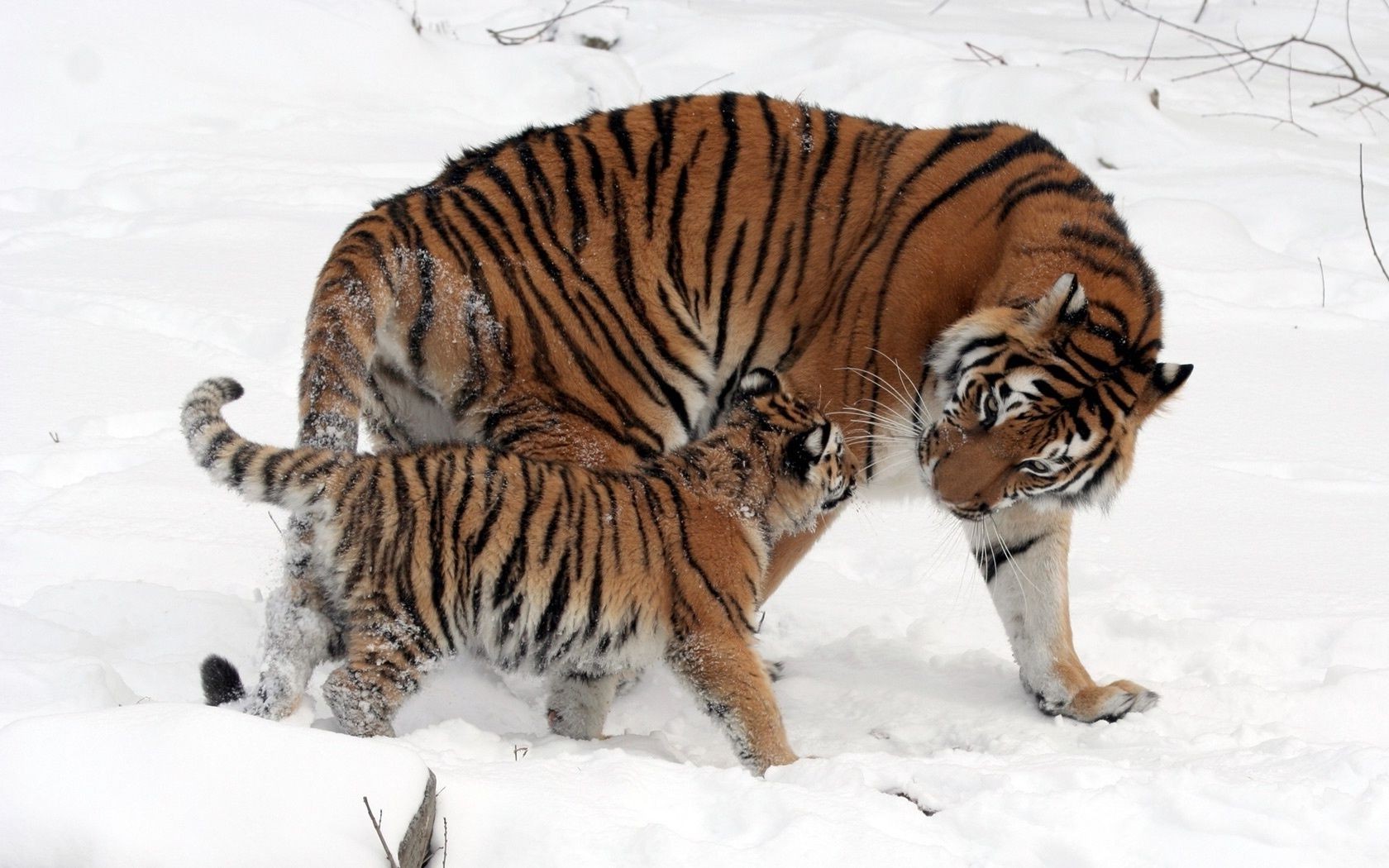 Tigre con un cucciolo di tigre che cammina sulla neve