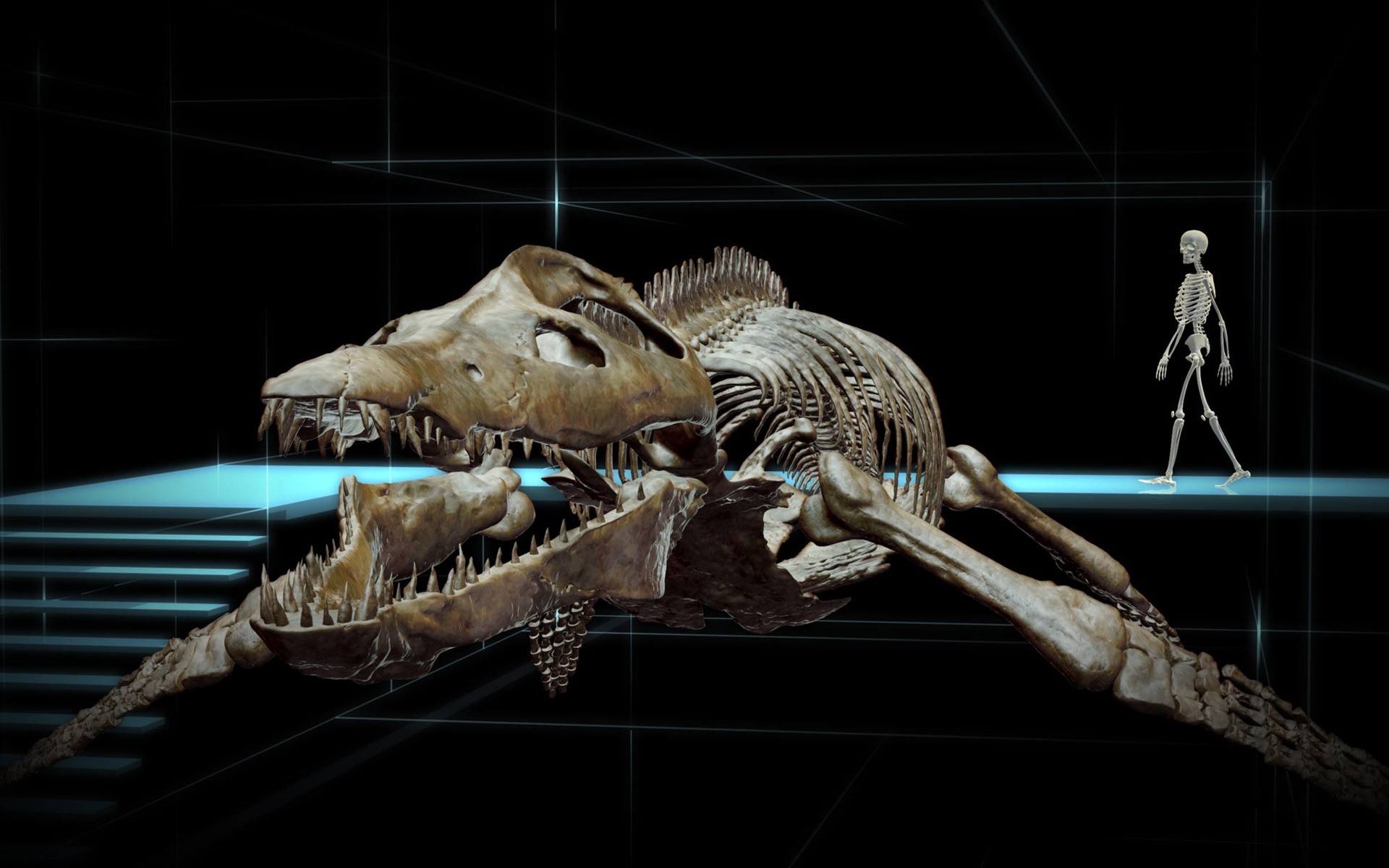 Ossa di dinosauro acquatico in confronto con l'uomo