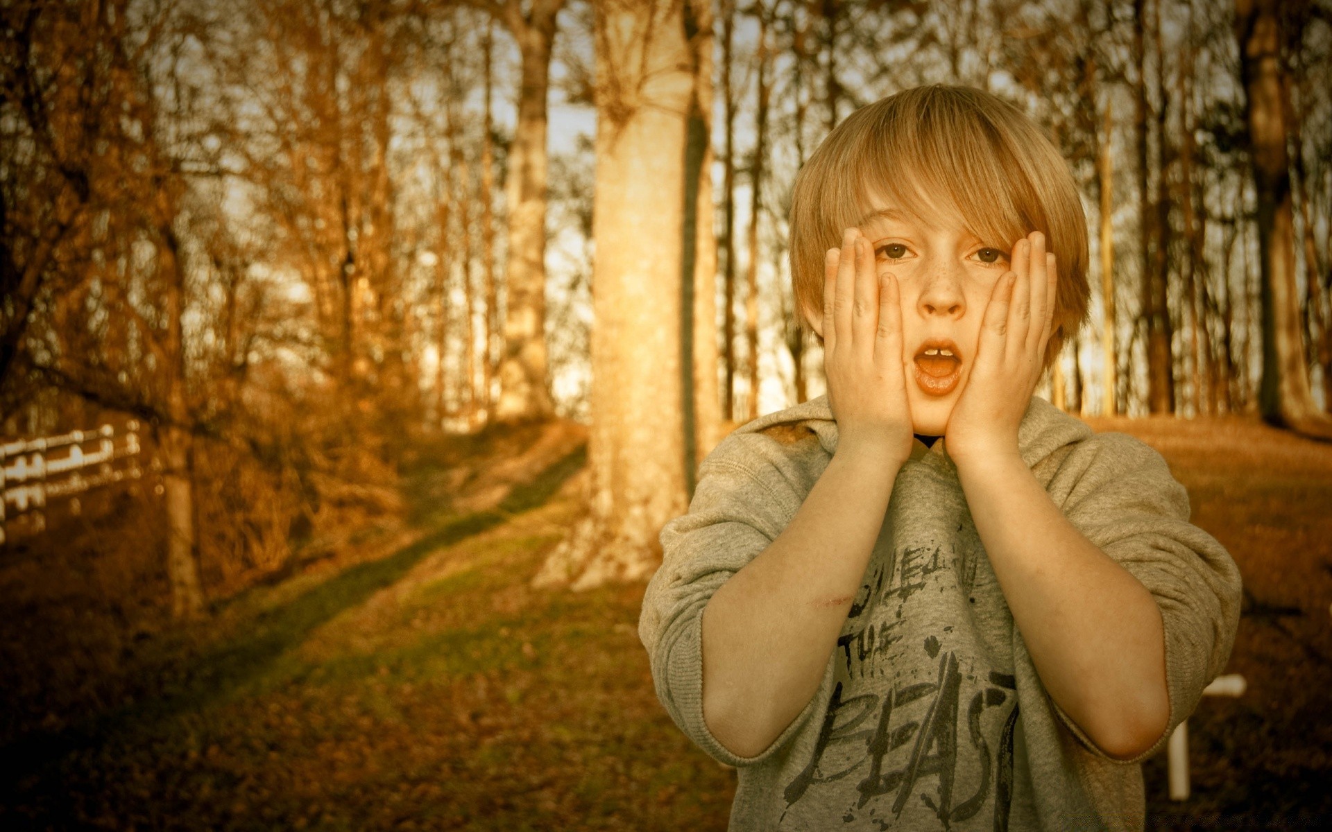 Un bambino carino in abiti bianchi ha le mani giunte sul petto