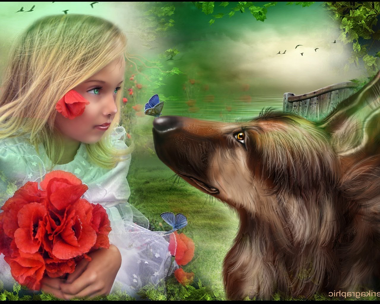 Ragazza con i fiori e cane da caccia amici