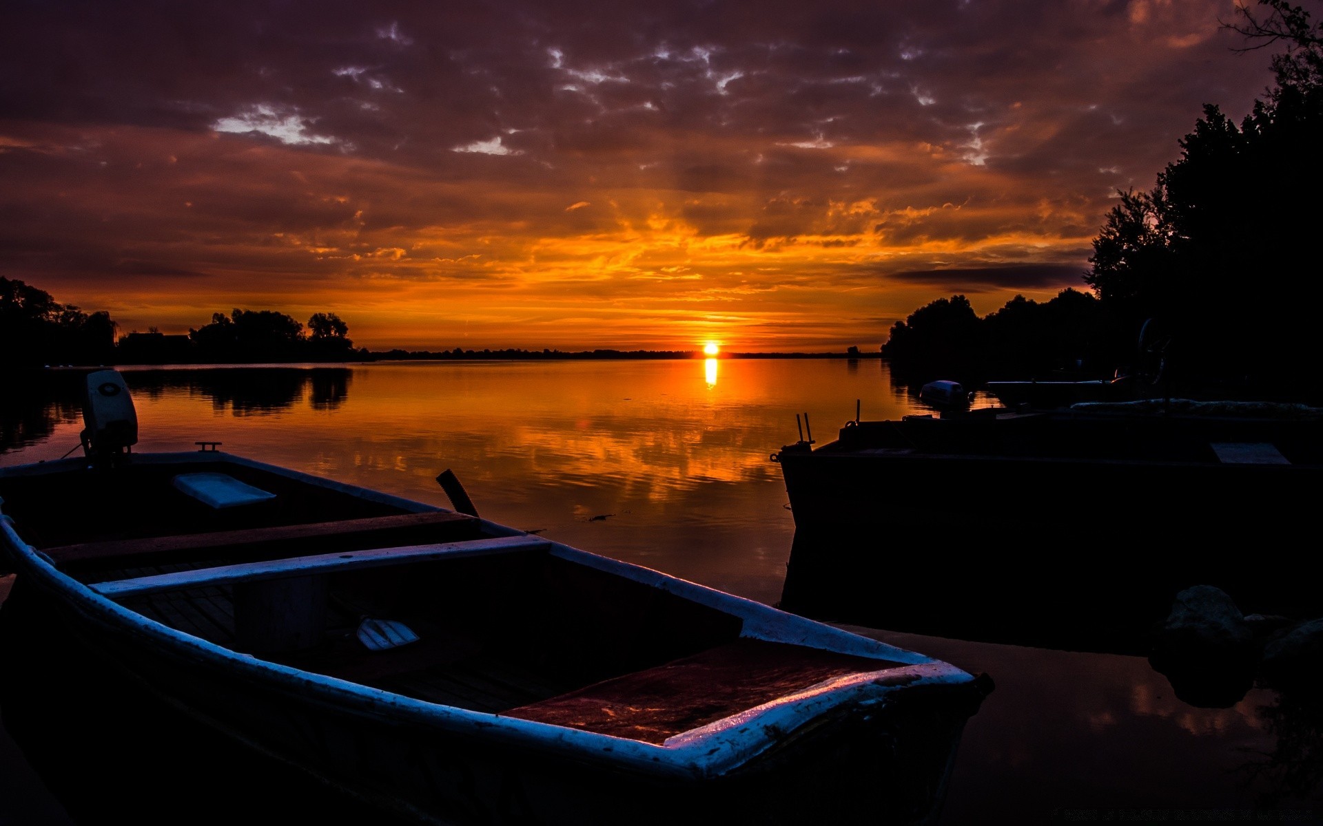 Barche sulla superficie del mare alla luce del sole al tramonto