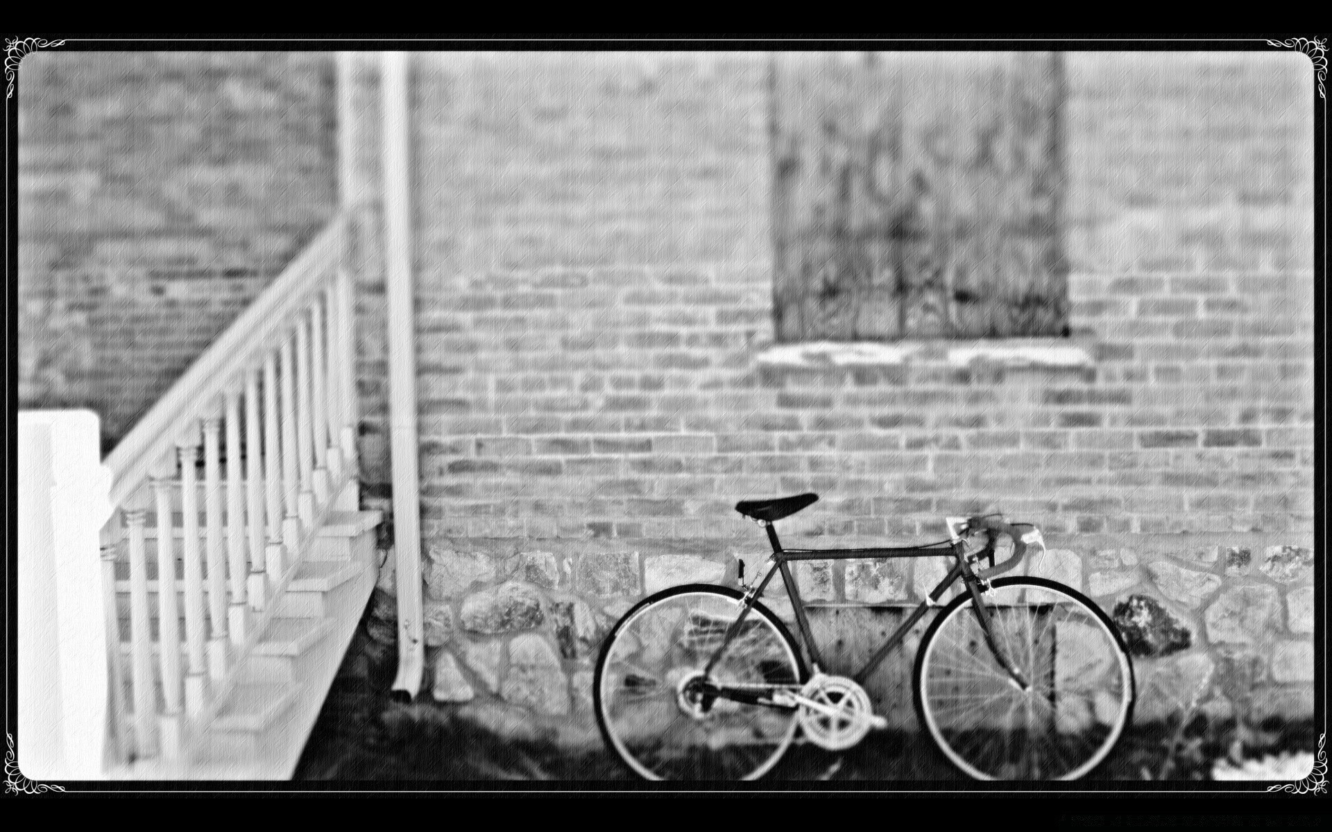 Bicicletta vintage contro un muro di pietra bianco e nero