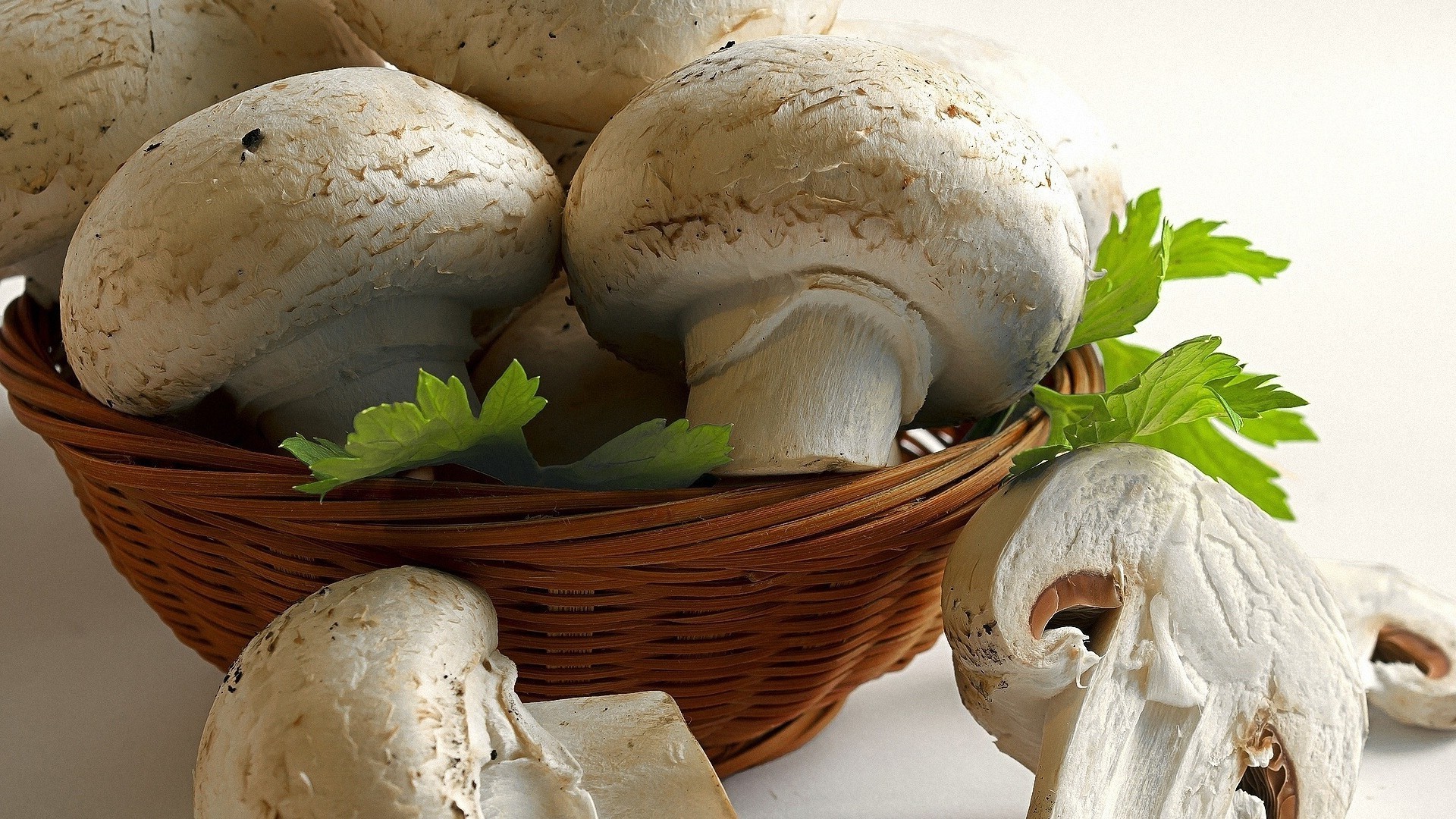 Funghi in un cestino su sfondo bianco