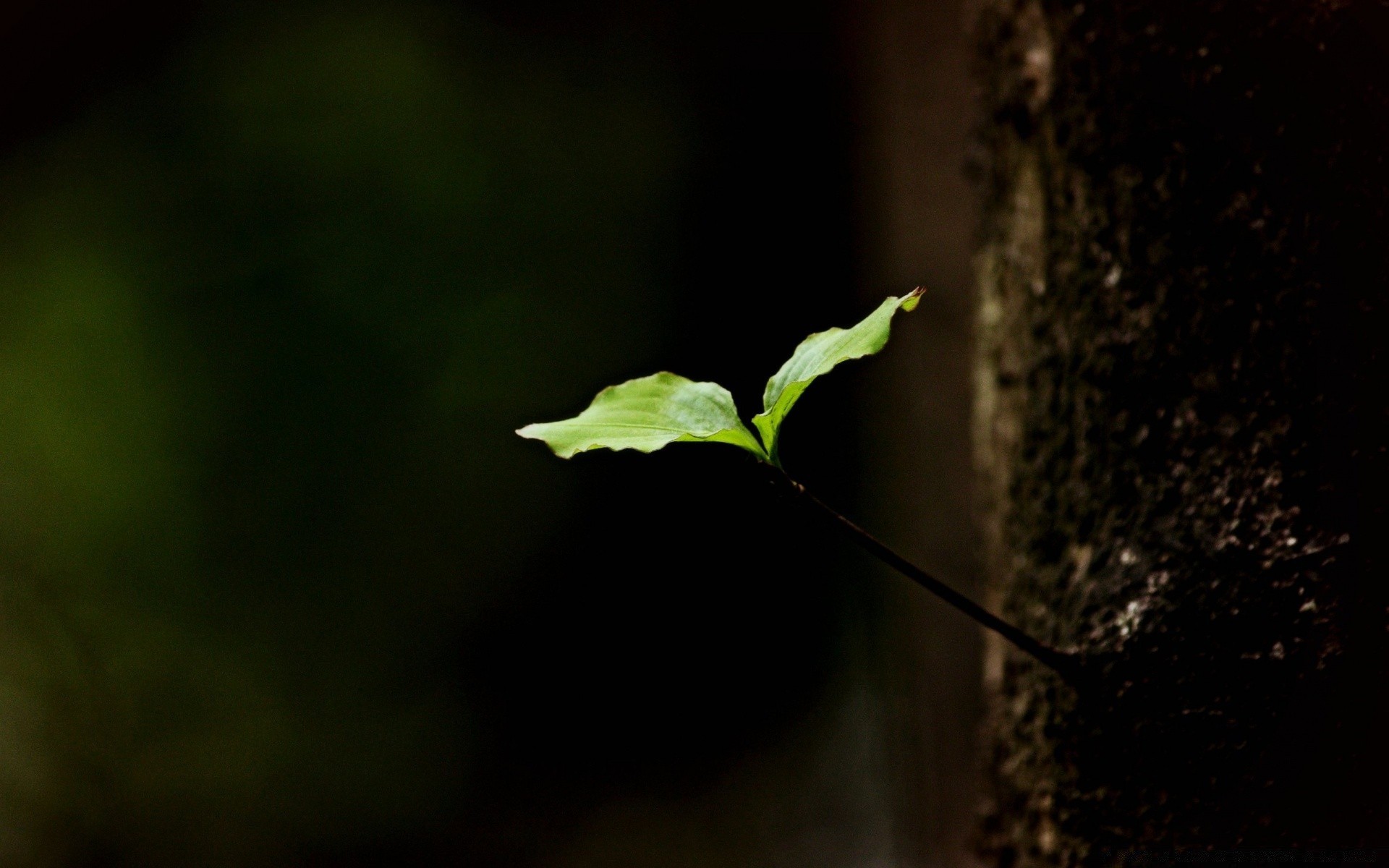 Due foglie verdi su un ramoscello su uno sfondo sfocato verde