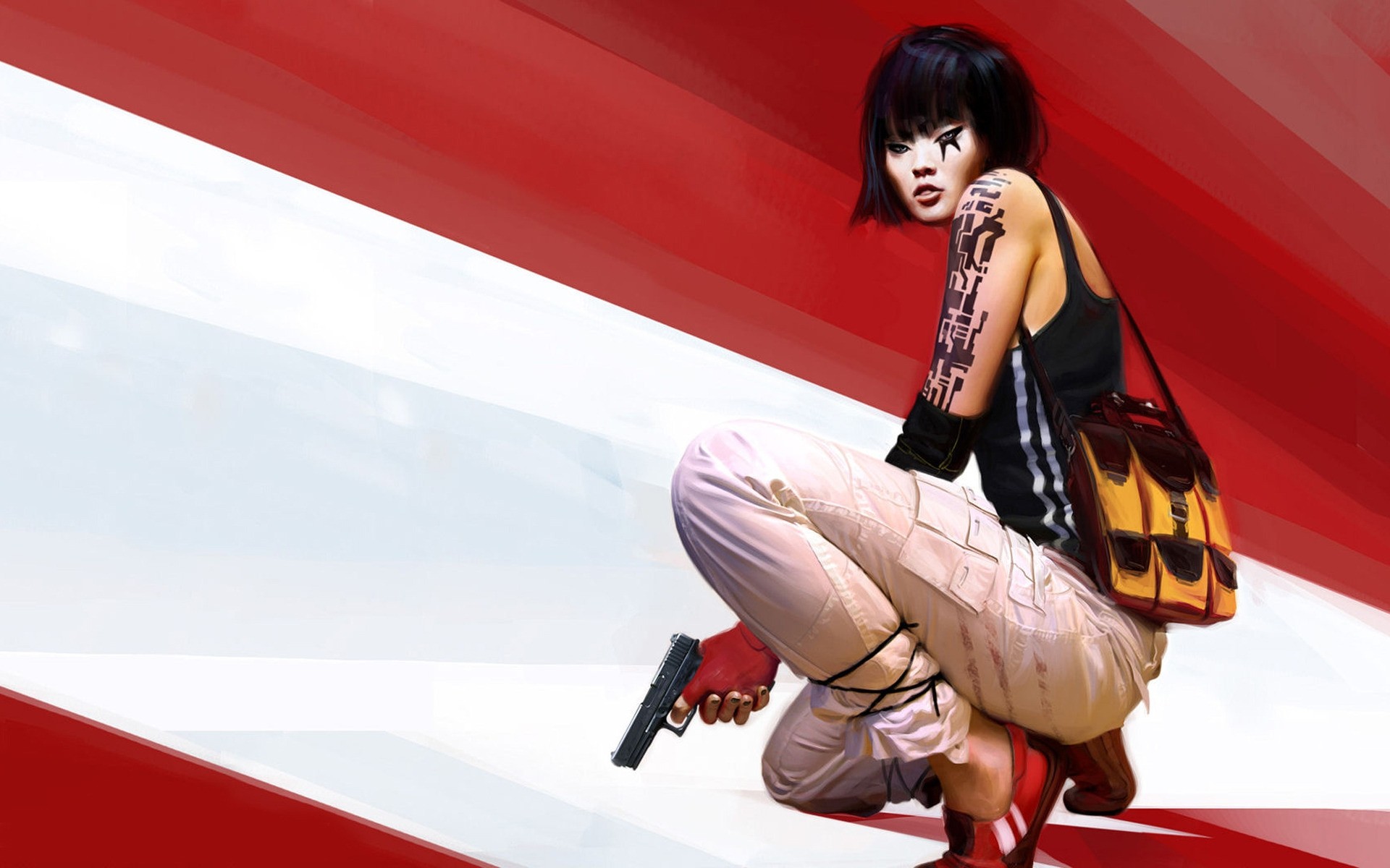 Ragazza asiatica seduta con borsa e pistola