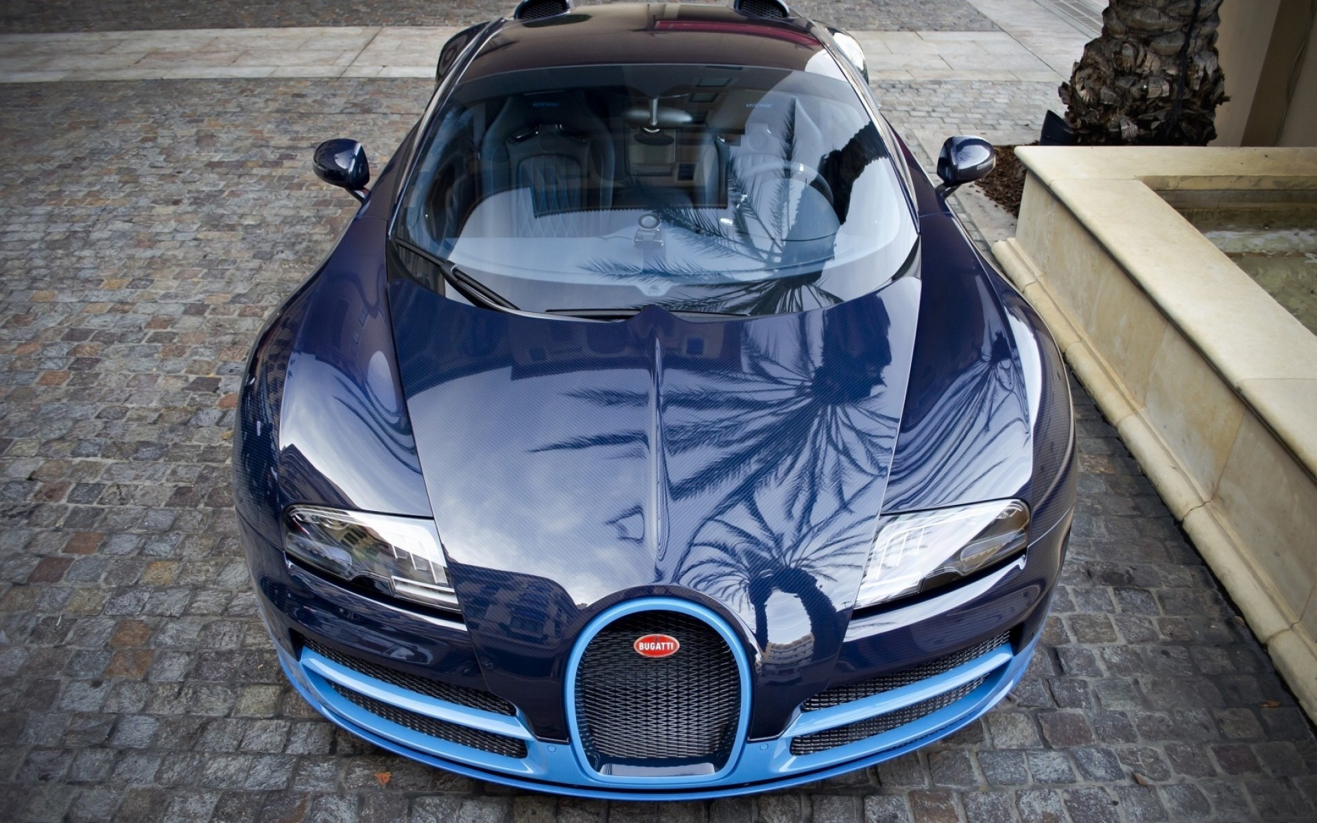 Auto sportiva Bugatti blu su uno sfondo di palme