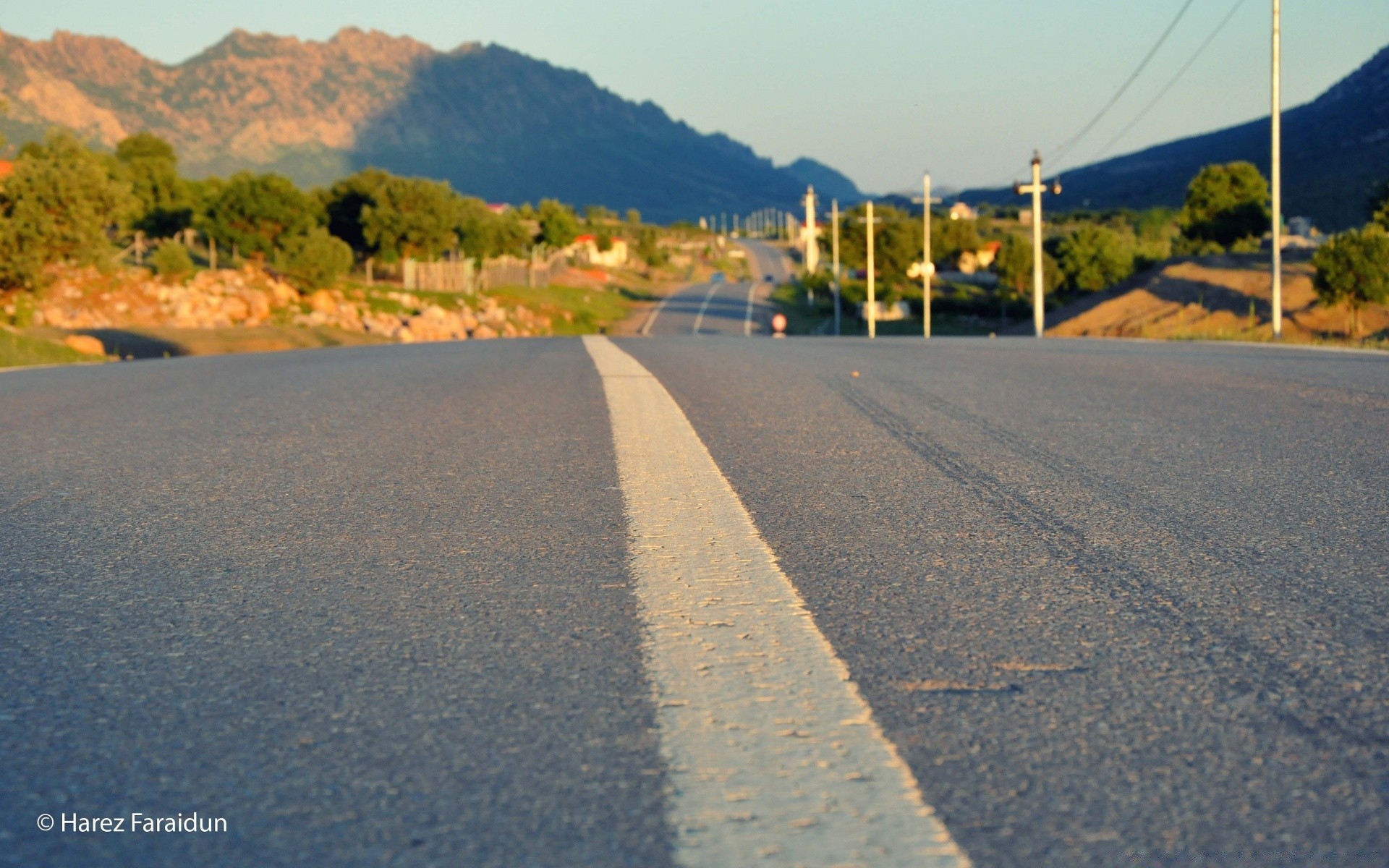Strada in macro su uno sfondo di montagne verdi