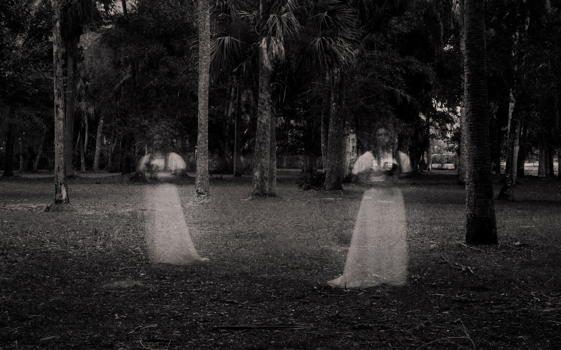 Fantasmi di una ragazza e del suo cane sotto la luna nella notteFantasmi di una ragazza e del suo cane sotto la luna nella notte