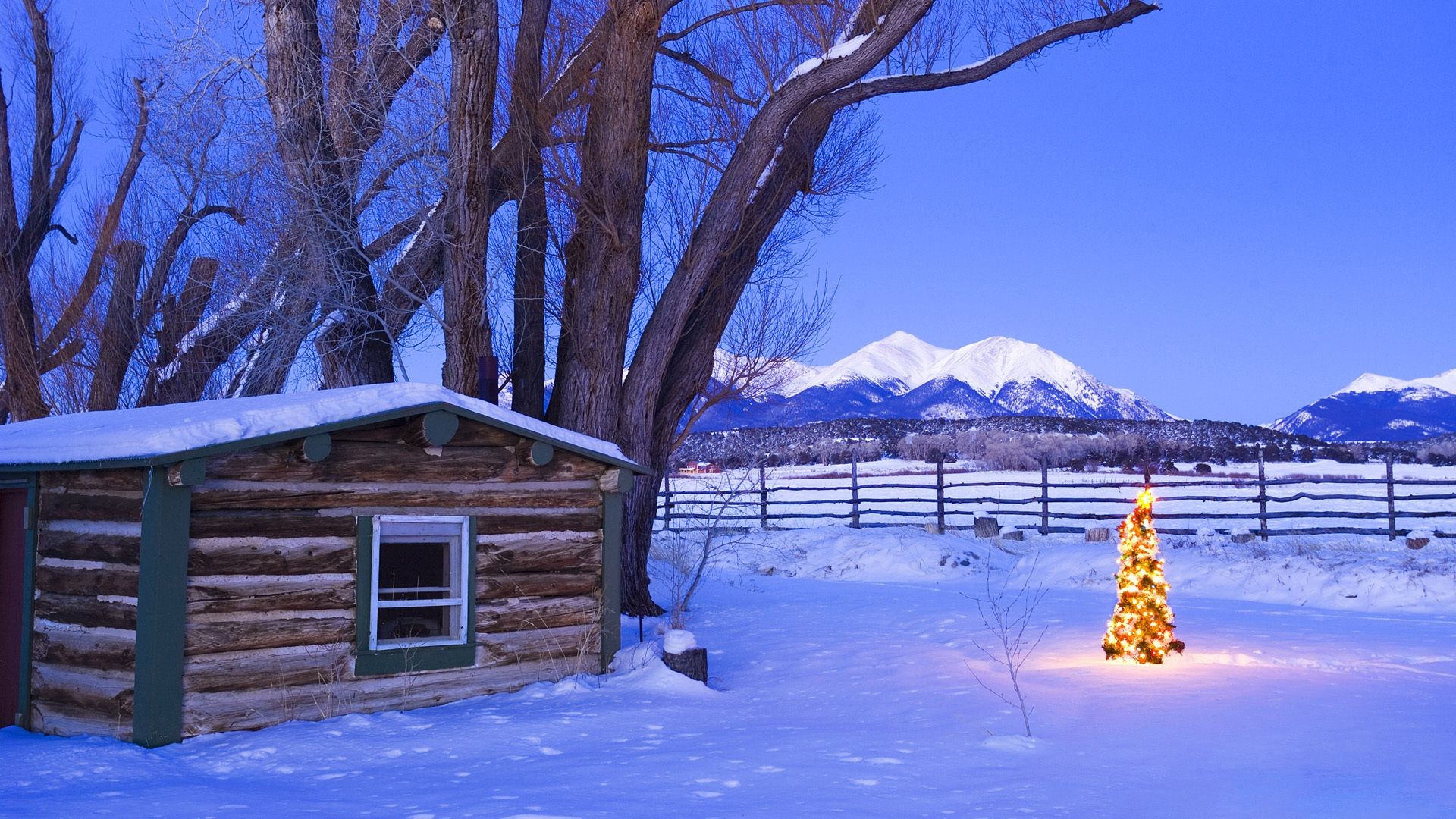 Bordo in inverno con alberi di Natale sullo sfondo delle montagne